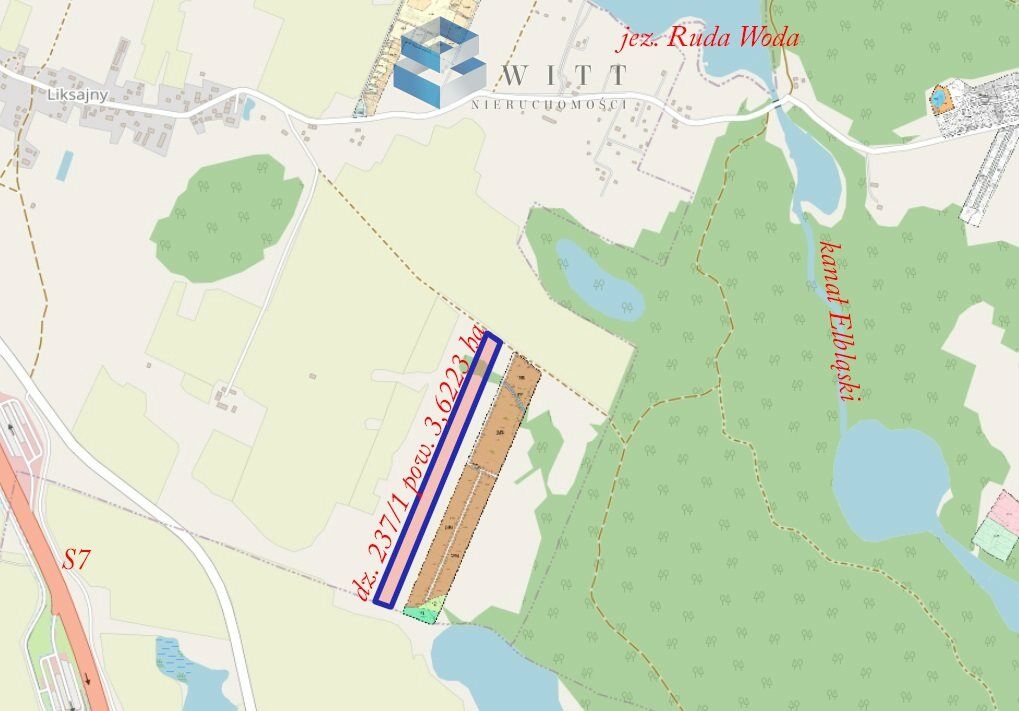 Prezentowana nieruchomość to działka nr 237/1 o powierzchni 36 223 m² (3,6223 ha), położona zaledwie 750 m od zwartej zabudowy turystycznej miejscowości Liksajny i tylko 6 km od centrum Miłomłyna, gdzie znajdziesz szkołę, przedszkole, sklepy, banki i inne niezbędne usługi.